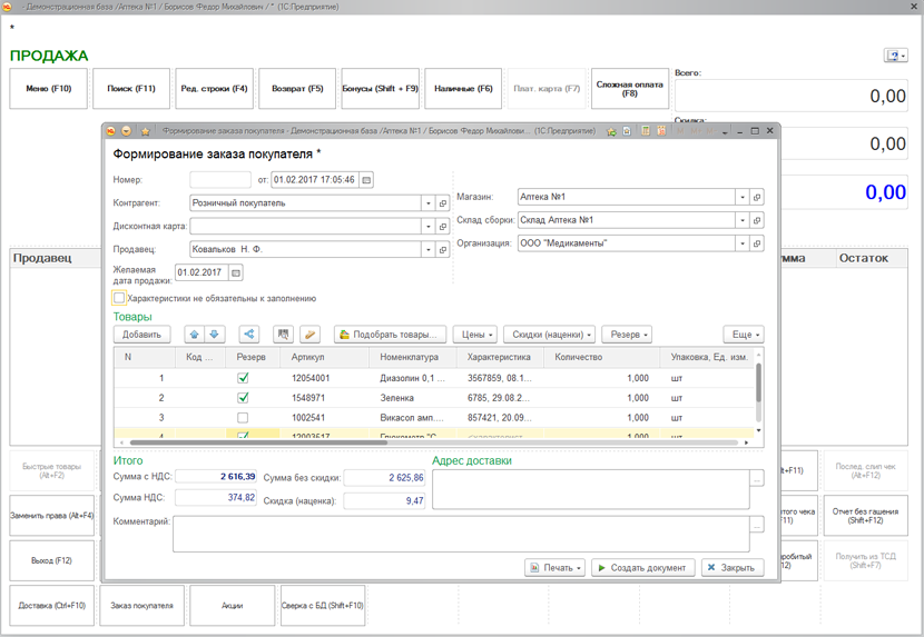 Решение "1С:Аптека" предоставляет пользователю специализированный интерфейс рабочего места первостольника для оформления розничных продаж. Для повышения эффективности продаж сопутствующих товаров реализован механизм учета товаров, продаваемых совместно. Данный механизм позволяет в ручном или автоматическом режиме подобрать список товаров продаваемых совместно. Для автоматического режима заполнения совместных товаров используется механизм поиска ассоциаций.