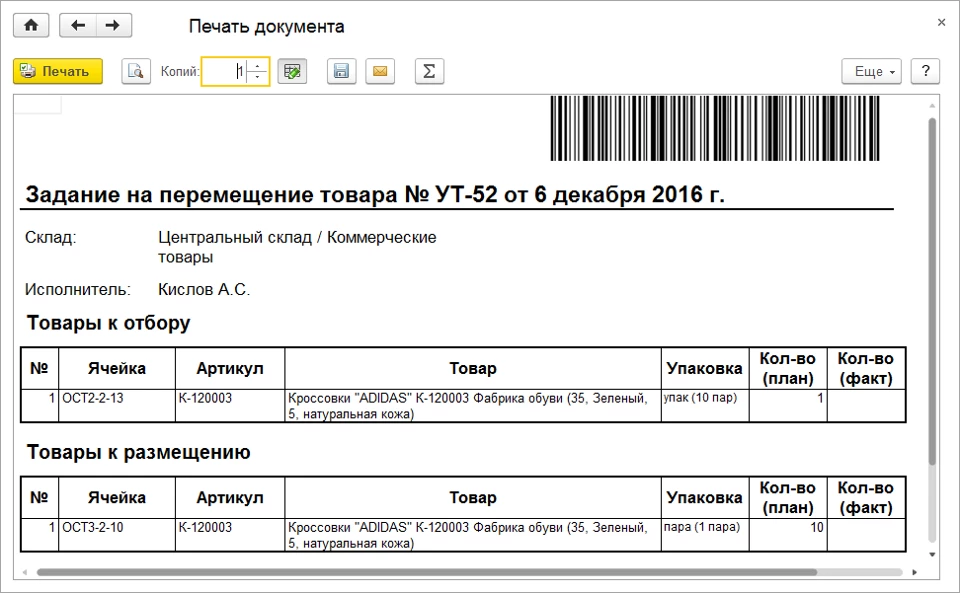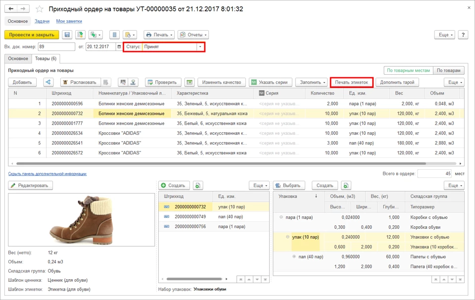 Принимать и отгружать товар с помощью специального рабочего места кладовщика. Во время приемки кладовщик отмечает, какие товары реально поступили на склад, а также может создать штрихкоды и распечатать этикетки на поступивший товар.