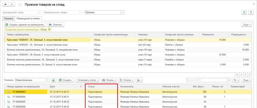 При поступлении товаров на адресный склад будет автоматически проконтролирована наполненность ячеек и будет предложено поместить товар в ту ячейку, которая наиболее подходит для товара в соответствии с его габаритами, весом и условиями хранения.
