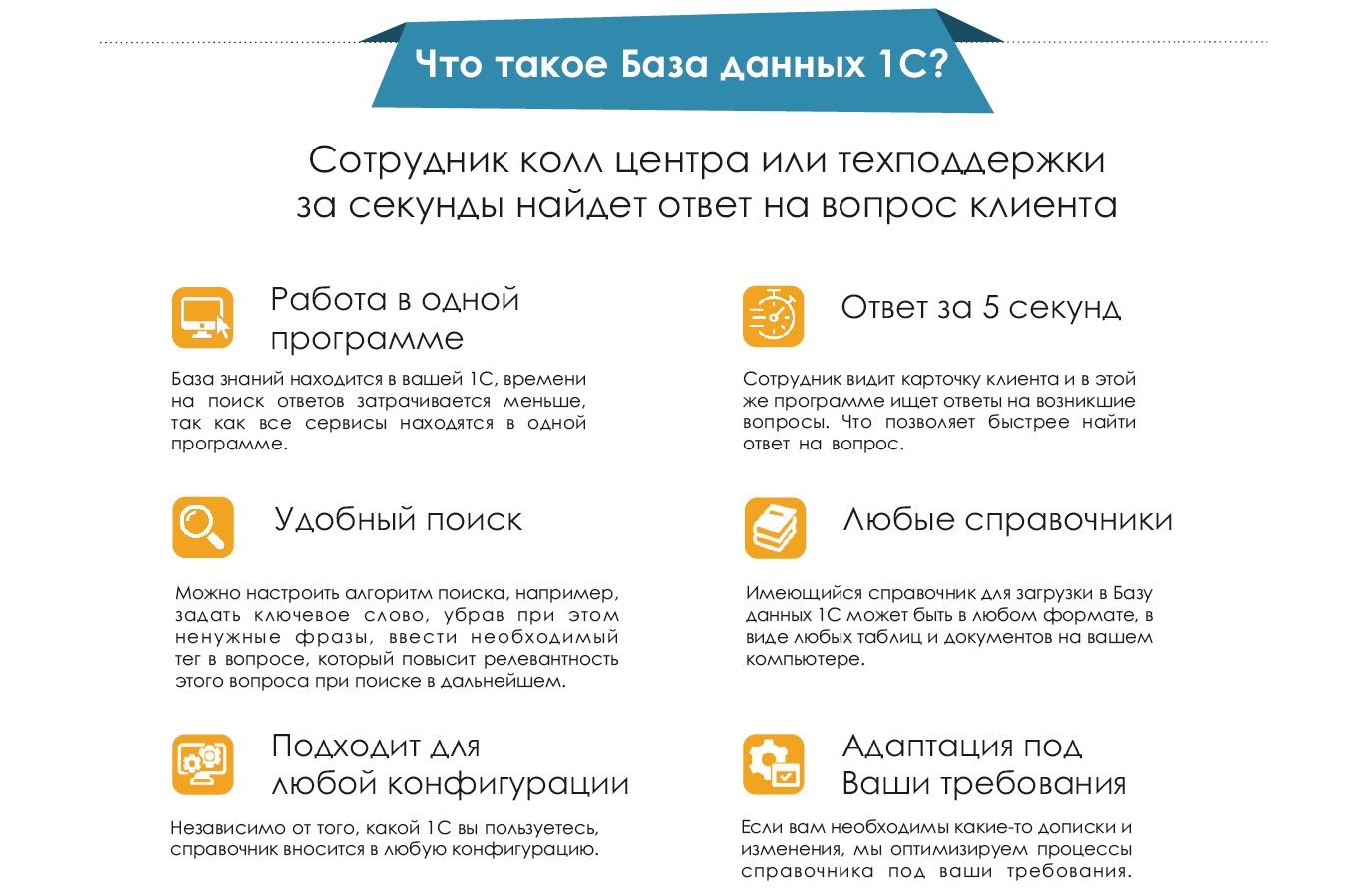 «База знаний 1С» позволяет загрузить в программу 1С любой справочник в формате вопрос-ответ. Подразумевает под собой хранение, организацию и управление знаниями, накопленными в процессе работы организации.