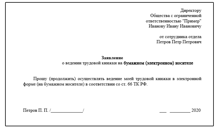 После ознакомления с нововведениями, сотрудники до 31 декабря 2020 года вправе написать заявление о выборе формата трудовой книжки.