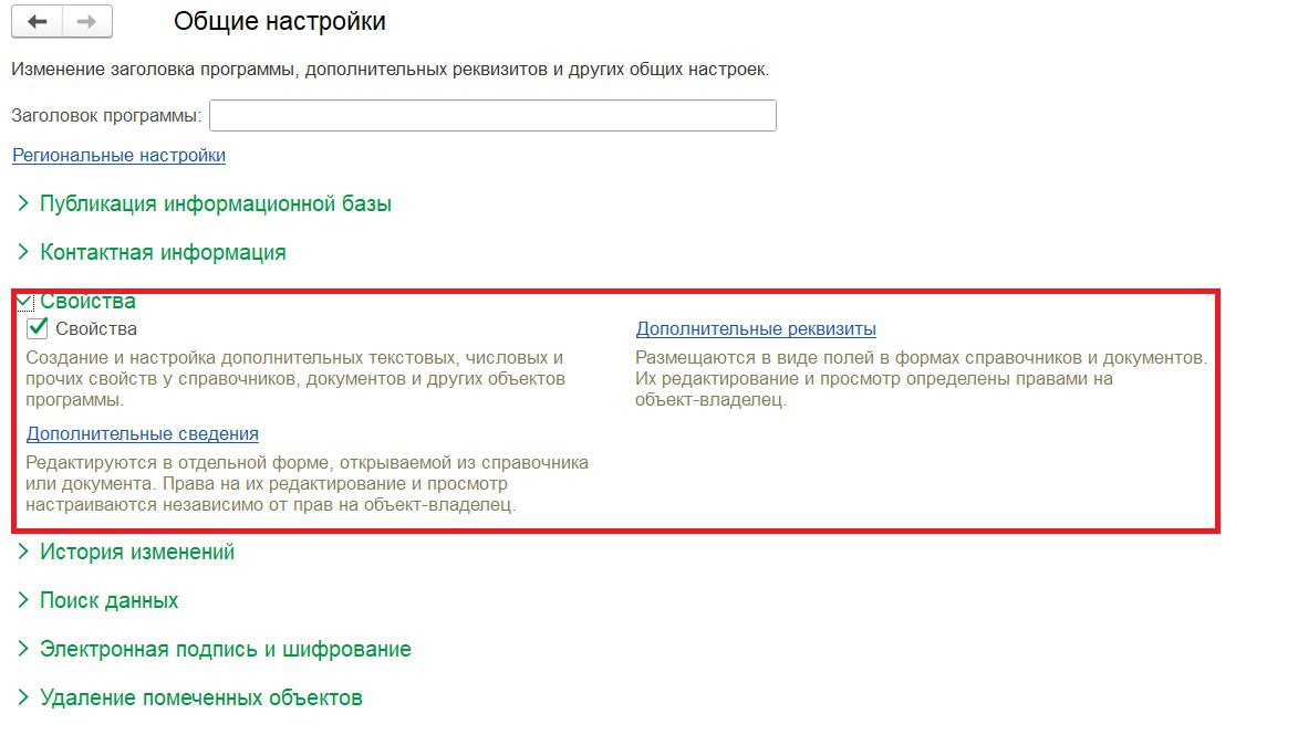 Чтобы включить такую возможность в программе 1С: Бухгалтерия редакции 3.0, необходимо перейти в раздел "Администрирование", затем в "Общие настройки" и установить флаг "Свойства".