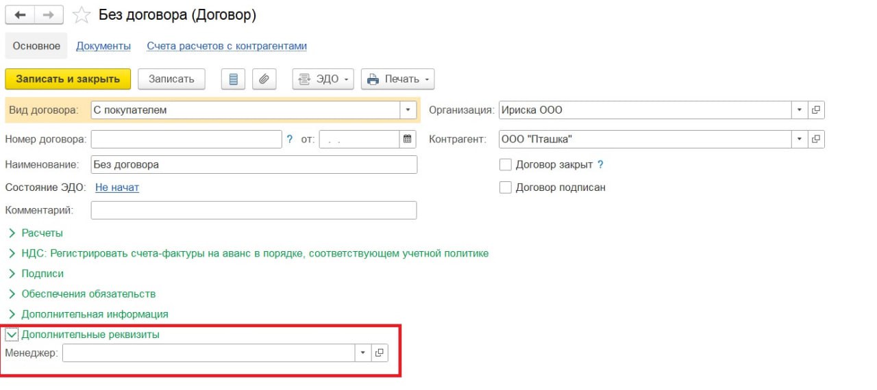 После настройки в справочнике появится дополнительное поле, где можно указать сотрудника, ответственного за взаиморасчеты по этому договору.