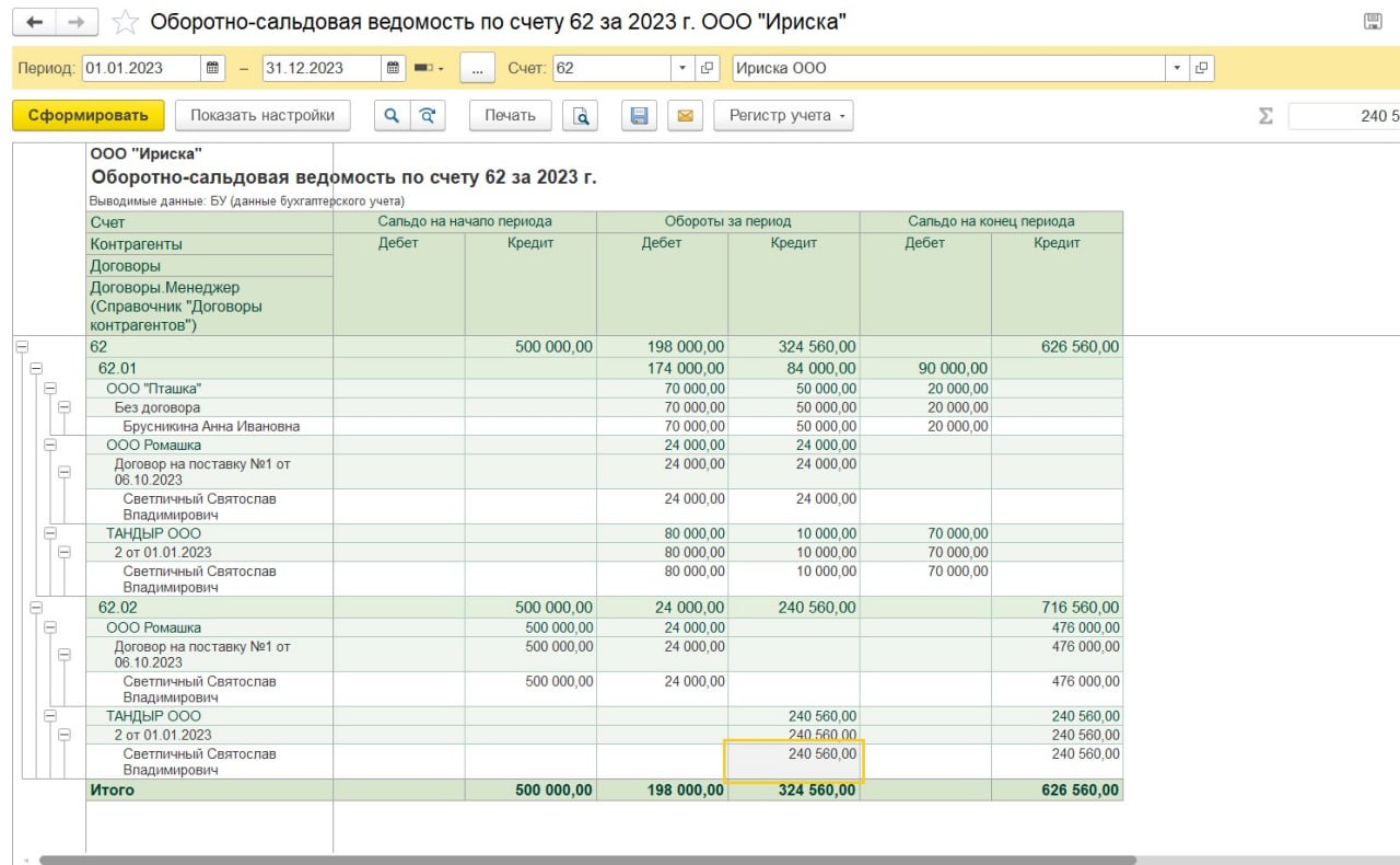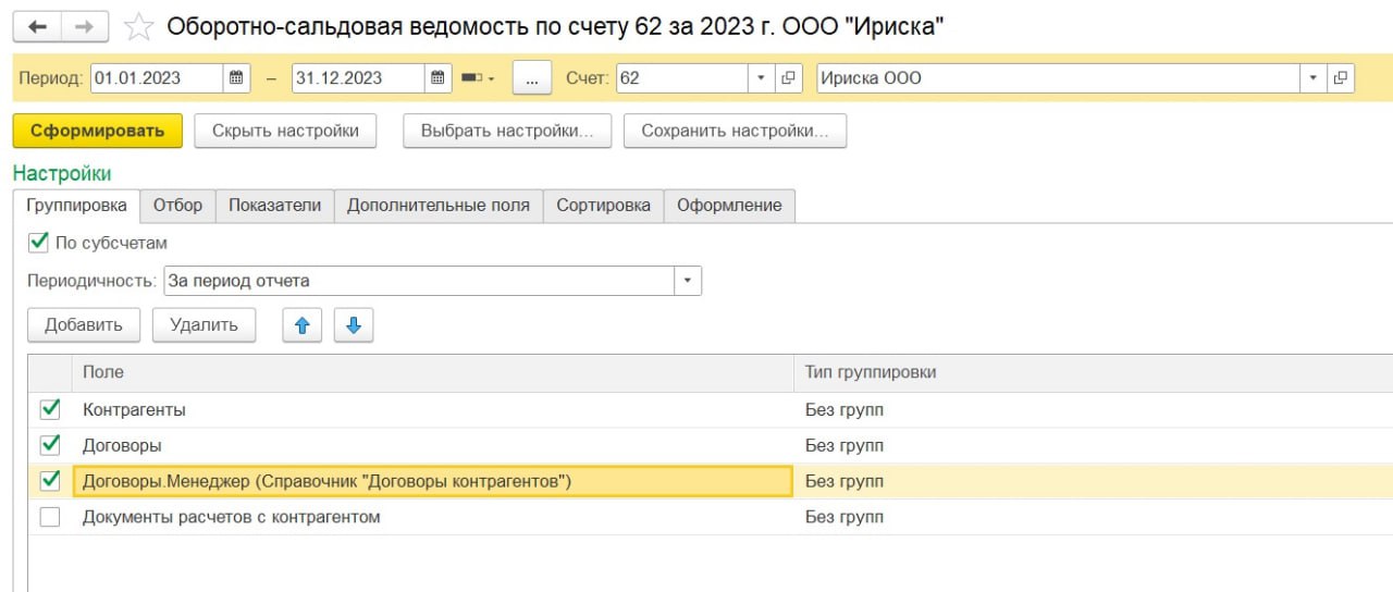 После заполнения данного поля в договорах эту информацию можно вывести в оборотно-сальдовую ведомость по 62-му счету, если сделать настройку как на скрине.