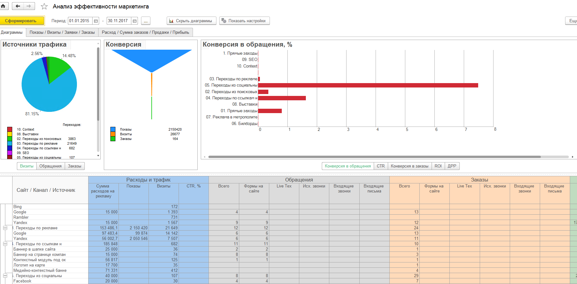 Блок маркетинга дополнительно настраивают, чтобы получить очень удобный отчет «Анализ эффективности маркетинга», в котором будут собраны результаты рекламной активности в интернет-среде (сайты, соцсети, Яндекс.Директ, AdWords и др.) и офлайновой рекламы, показатели которой можно будет забить ручным вводом. Вы будете видеть, сколько средств было потрачено на канал продвижения и насколько он оказался эффективен.