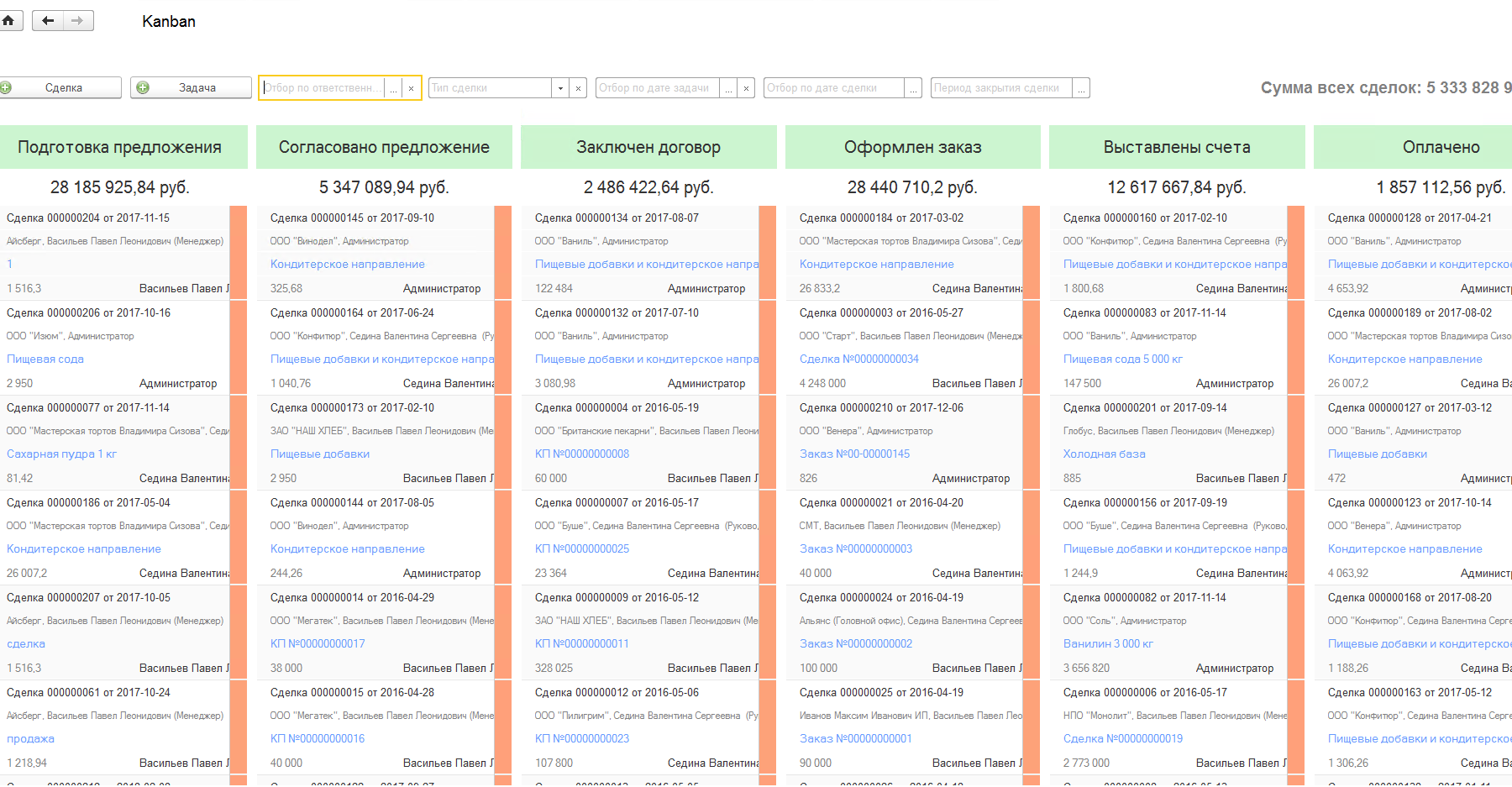 Благодаря системе Канбан, вы всегда будете знать, сколько денег с продаж получит ваша компания. Здесь будут отображаться данные о выставленной в счетах сумме, будет показана информация о том, кто их выставлял, какие договоры уже заключены, а кто уже готов оплатить. Одним щелчком вы можете изменить стадию сделки, просто перетащив ее на следующий уровень.