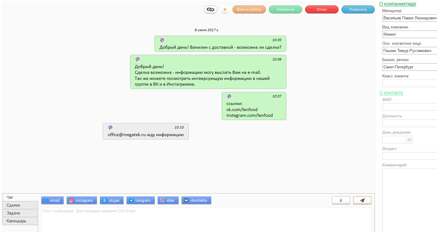 Впечатляет в программе функционал омничата, где в одном окне вы можете видеть сообщения клиентов из разных каналов коммуникации (официальный сайт, социальные сети, интернет-магазин и т.д.) и оперативно отвечать на вопросы, повышая лояльность клиентов.