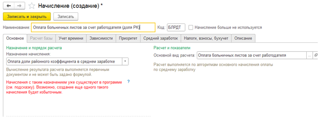 В карточке каждого нового начисления найдите поле «Основной вид расчета» и укажите базовое начисление (например, «Больничный за счет работодателя»).