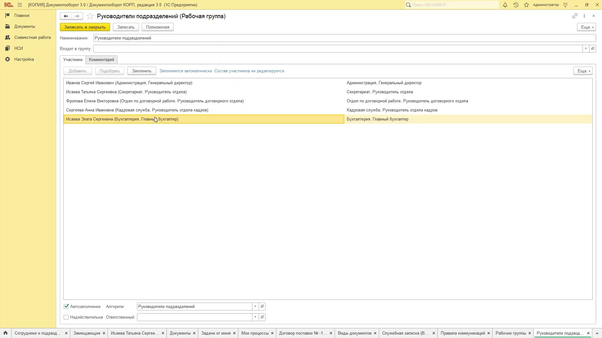 Теперь в 1С:Документооборот появилась возможность при заведении сотрудника включать его в рабочую группу автоматически (вновь принятый сотрудник появляется в этом списке). При приеме на работу сотрудника любой должности указываются подразделения, должность, положение в иерархии компании, и вся эта информация появляется в Рабочей группе автоматически по прописанному алгоритму при нажатии кнопки “Заполнить”.