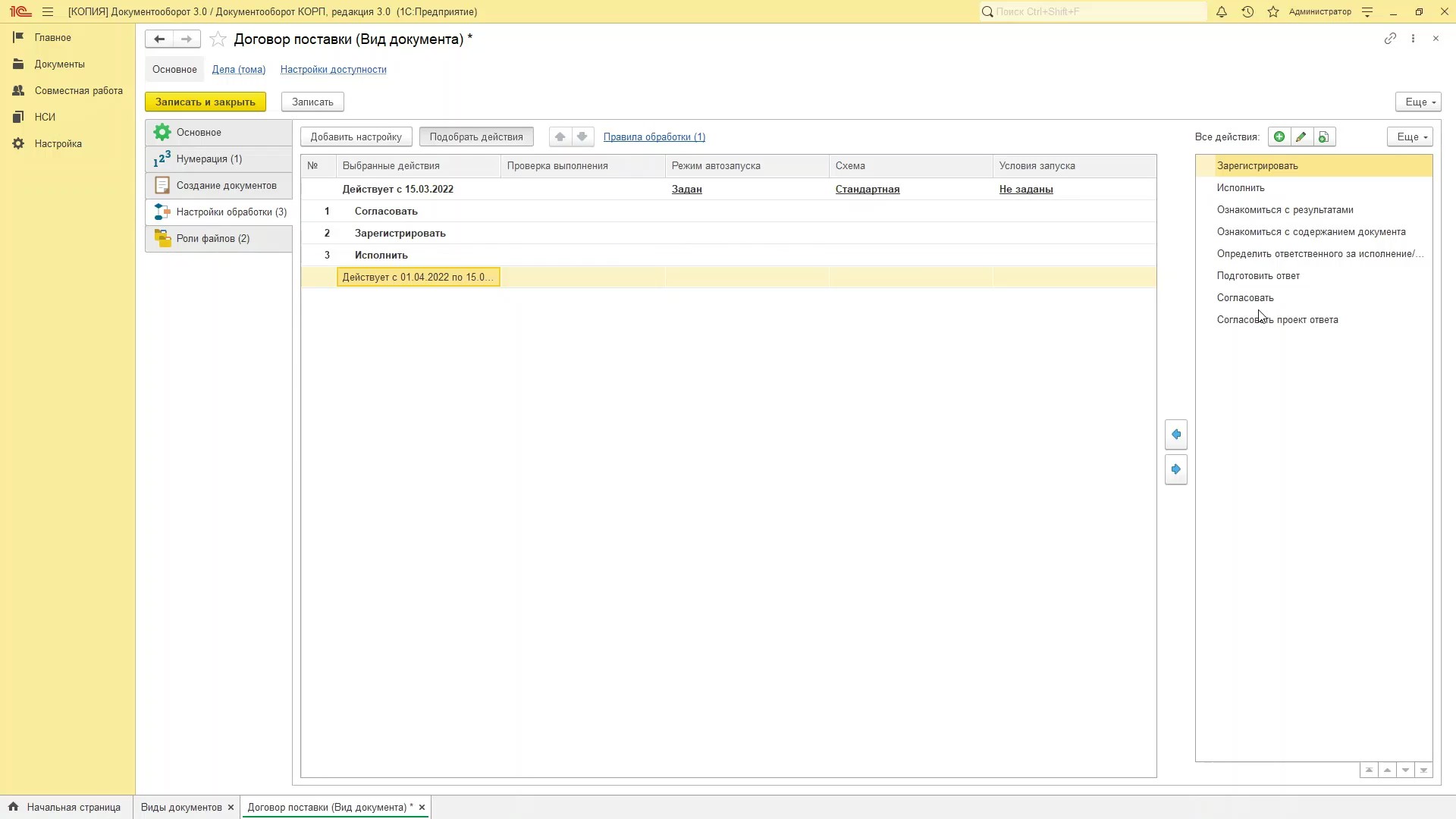 Как и в предыдущей версии документооборота, для всех видов документов, есть настройки доступности. Но в ДО 3.0 появилась возможность управлять ими более гибко. Таблицу можно отсортировать по виду действия, видам документа, договорам и т.д. Теперь, например, если у документа несколько этапов в согласовании, то можно в настройках конечного этапа экспертизы документа запретить сотрудникам редактировать файл или какие-то ключевые поля в карточке документа.