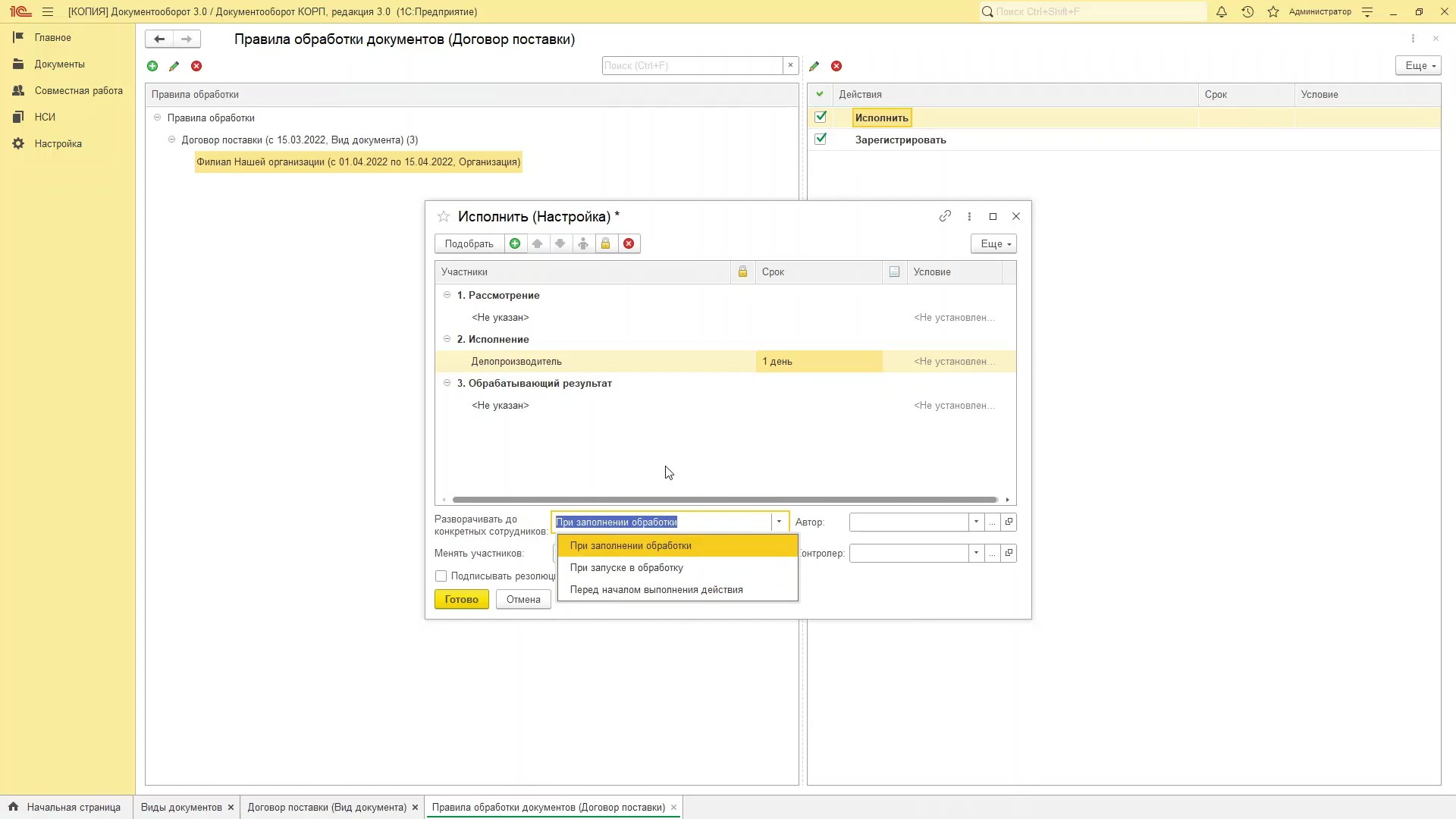 И еще одно из важнейших нововведений в Документооборот 3.0 — это новый механизм обработки документов. Теперь в программе обработка документа состоит из последовательности действий, выполняемых по правилам обработки. А вся информация о действии над документом собрана в одном месте (на закладке Обработка в карточке документа): кто, что и когда сделал, куда был направлен документ, какие сроки и т.д.