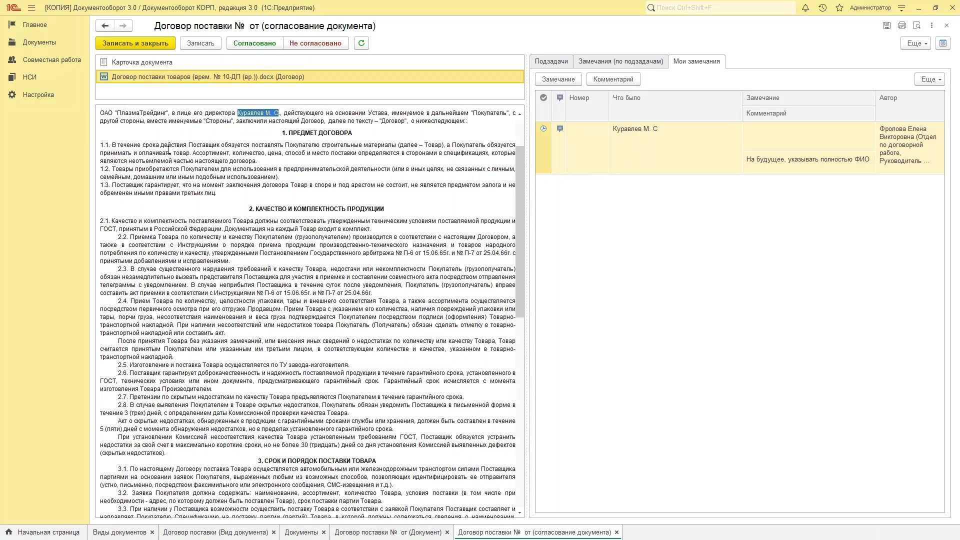 В Документообороте 3.0 наконец-то появилась функция, которую многие ждали. Теперь можно оставлять замечания и комментарии к шаблону документа. Причем делать это могут сразу несколько пользователей. А инициатор отработав все замечания, может сформировать из них протокол разногласий.