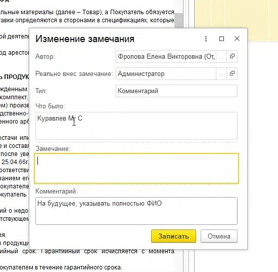 Один из плюсов данного функционала в том, что программа 1С хранит все изменения. По этим изменениям в дальнейшем можно сформировать протокол замечаний.
