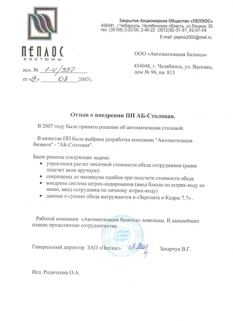 В рамках данного проекта автоматизирована столовая швейного предприятия "Пеплос". В качестве ПП была выбрана разработка компании "Автоматизация бизнеса" - "АБ-Столовая".