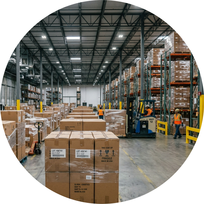Территория склада разбита на зоны приемки, хранения, отгрузки товара. Организовано тотальное сканирование товаров.