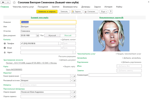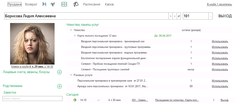- Доступна детальная информация о клиентах клуба – информация контакта, фотография, удостоверения личности, статусы клиентов, теги, родственники, договоры, членства и пакеты услуг, взаиморасчеты и прочее.