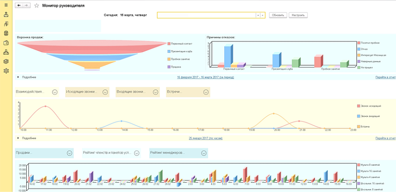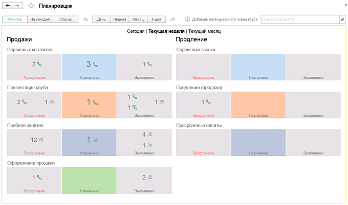 - Интерфейс "Руководитель отдела продаж": блок мониторинга задач менеджеров по работе с клиентами и контролем их исполнения, анализ загрузки клуба, воронка продаж.