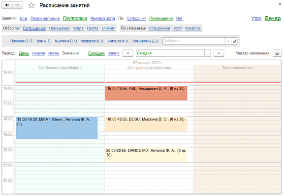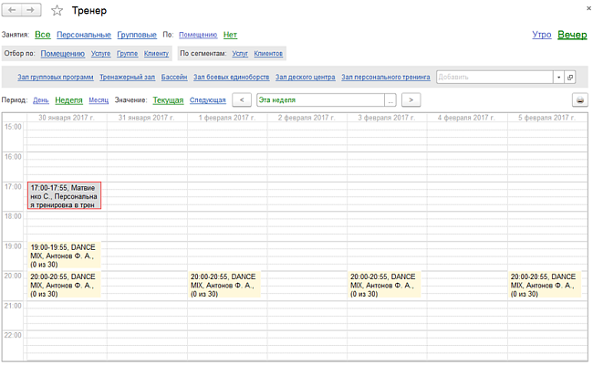 - Групповые и персональные занятия. Функция включает в себя предварительную запись на персональные занятия и групповые тренировки. В программе реализован планировщик групповых и персональных занятий.