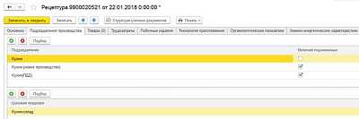 - "Выпуск с розничной реализацией" (осуществление списания ингредиентов по рецептам, отражение факта выпуска блюд в кладовой), готовая продукция на склад места продажи и учтена розничная реализация. При использовании механизма "Интеркомпани" возможно реализация в рамках одного документа от имени 2 различных учреждений.