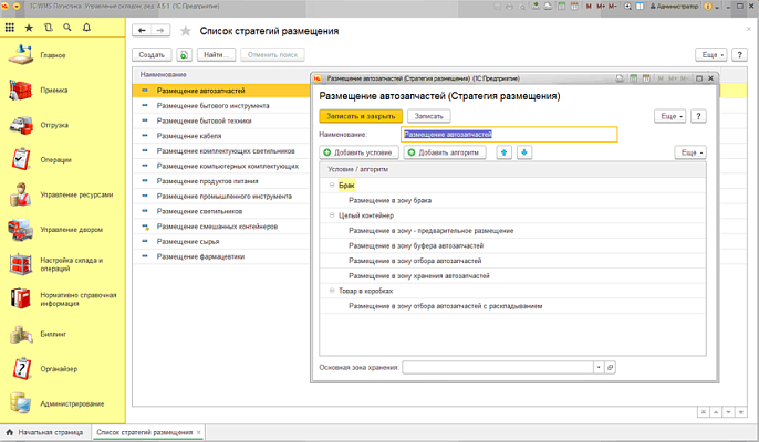 Все перечисленные принципы могут быть настроены в системе в справочнике «Стратегии размещения».