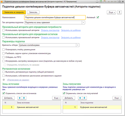 Индивидуальные параметры подпитки настраиваются на уровне товара и выделенной зоны или ячеек отбора для товара. Подпитка зоны (фиксированных ячеек) отбора может производиться и зоны основного хранения, зоны ближнего буфера или зоны приемки. Правила подпитки определяются в стратегиях подпитки.