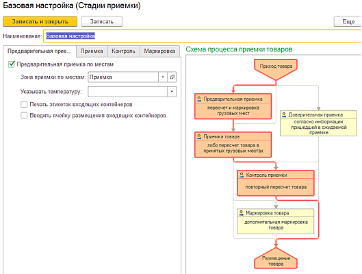 Процесс приема поставки оформляется документом «Приемка». Процедура приемки товара включает в себя выгрузку товара в зоне приемки, идентификацию и пересчет поступившего товара, приведение товара к стандарту складского хранения и т.д.