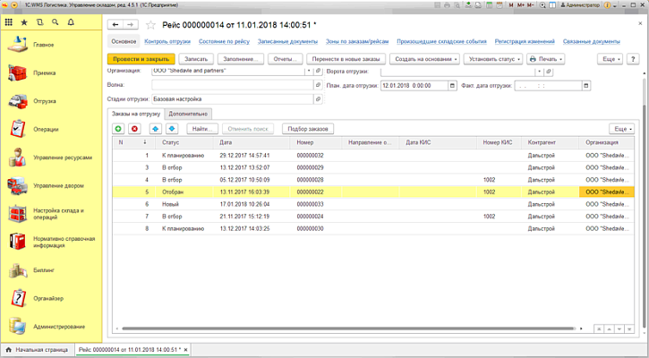 «Заказы на отгрузку» могут быть объединены в рейсы по маршрутам доставки. Данные о рейсах маршрута объезда транспортных средств содержаться в документе «Рейс». Рейс может быть создан на основании данных, полученных из системы корпоративного учета, системы управления доставкой, или Диспетчером склада в WMS Логистика. Управление складом.