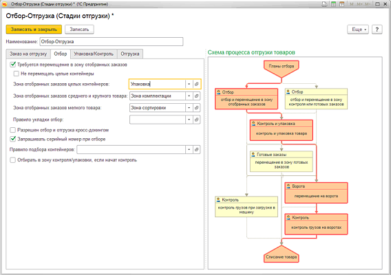 Отгрузка товара со склада осуществляется на основании плана отгрузки, загруженного из корпоративной информационной системы. План того, что должно быть отгружено со склада, содержится в документе «Заказ на отгрузку». Возможными направлениями отгрузки могут быть отгрузка покупателю (клиенту), перемещение на другие склады компании, возврат поставщику, отгрузка товара (сырья и материалов) в производство.