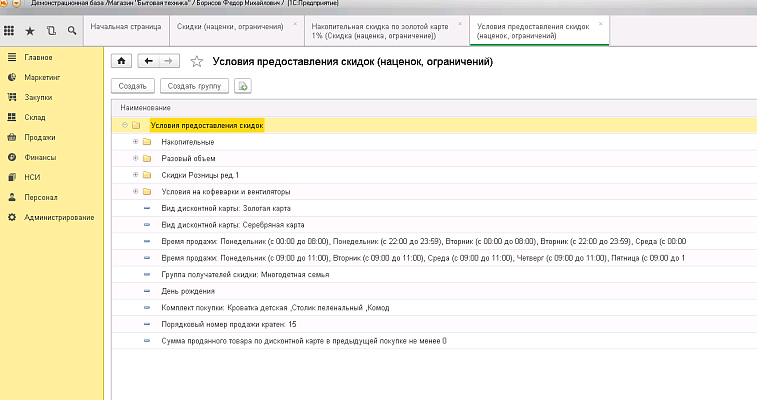 Предлагаемые в конфигурации предварительно настроенные профили пользователей соответствуют типичным должностям сотрудников магазина и позволяют им работать в программе без предварительной настройки прав доступа.