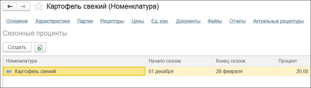 Сезонные коэффициенты. Использование механизма сезонных коэффициентов позволяет учесть «плавающий» процент холодной обработки ингредиента в зависимости от сезона. Нет необходимости каждый раз заводить новую рецептуру.