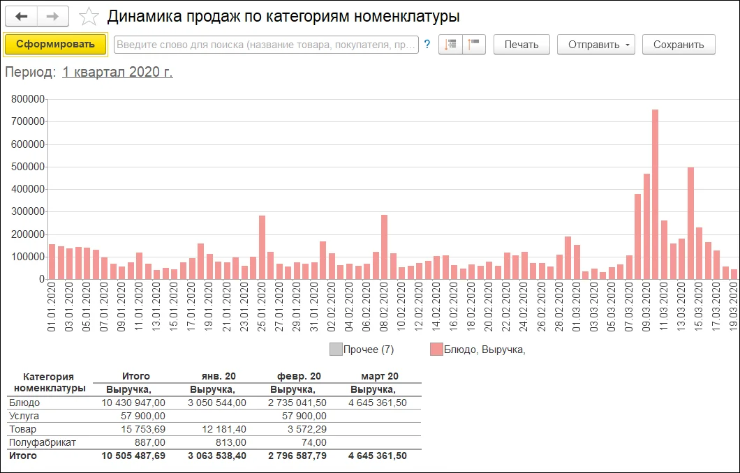 Отчеты Движения по видам операций и Остатки и обороты по видам операций позволяет получить самую полную картину движения товара или блюда.
