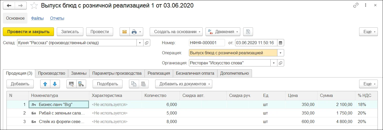 Учет производства побочных блюд позволяет учитывать производство дополнительной продукции в ходе приготовления. Например, при варке бульона в качестве дополнительного блюда будет оприходована отварная курица.