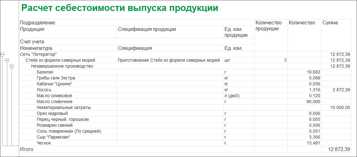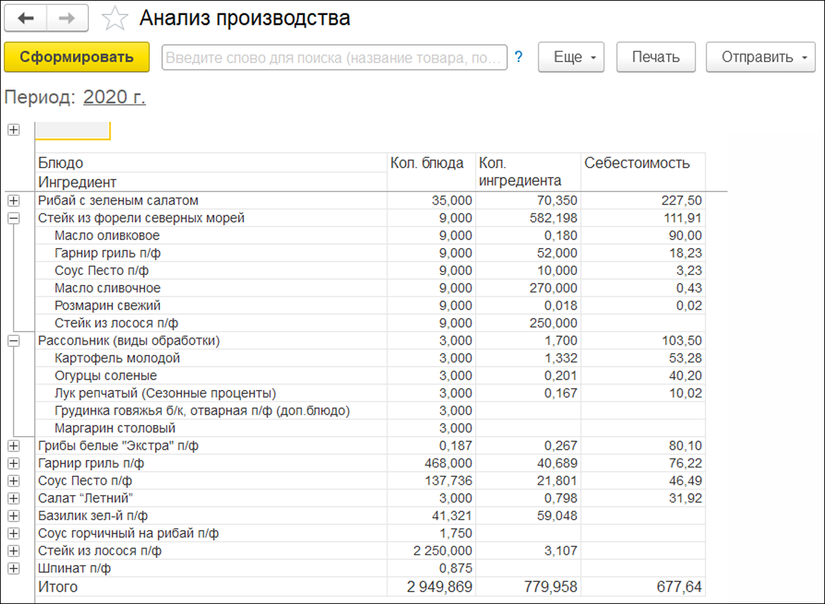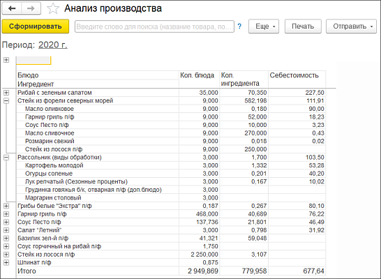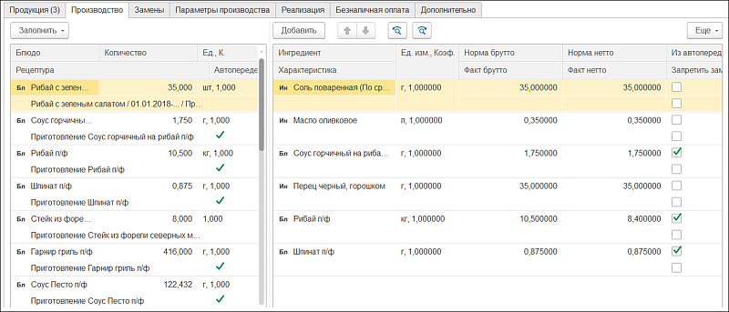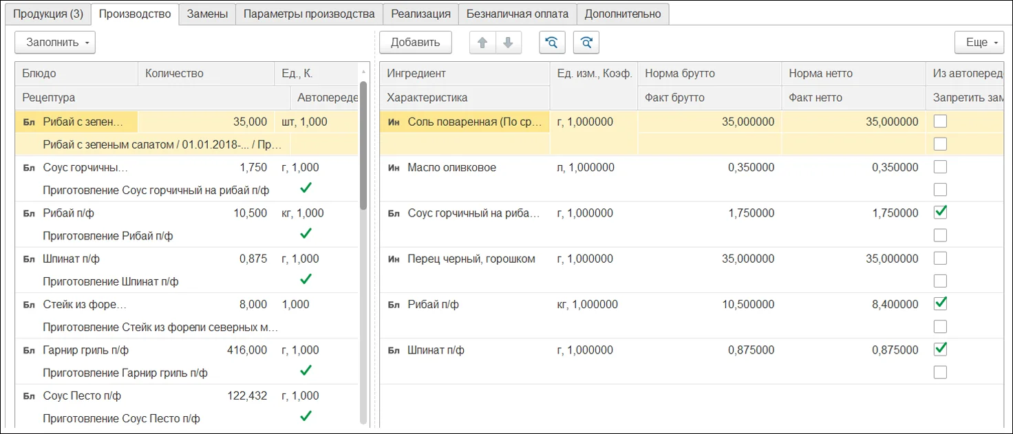 Учет приготовления полуфабрикатов и блюд, а также количества и сумм списанных в производство ингредиентов, согласно заведенным ранее рецептурам, с возможностью оценки потребностей ингредиентов и их обеспечения.