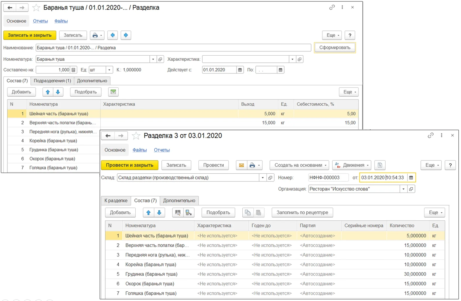 Операция разделки. Данный функционал позволяет учитывать все составные части после разделки цельного сырья (мясной туши или цельной рыбы) для последующего использования в рецептурах приготовления.
