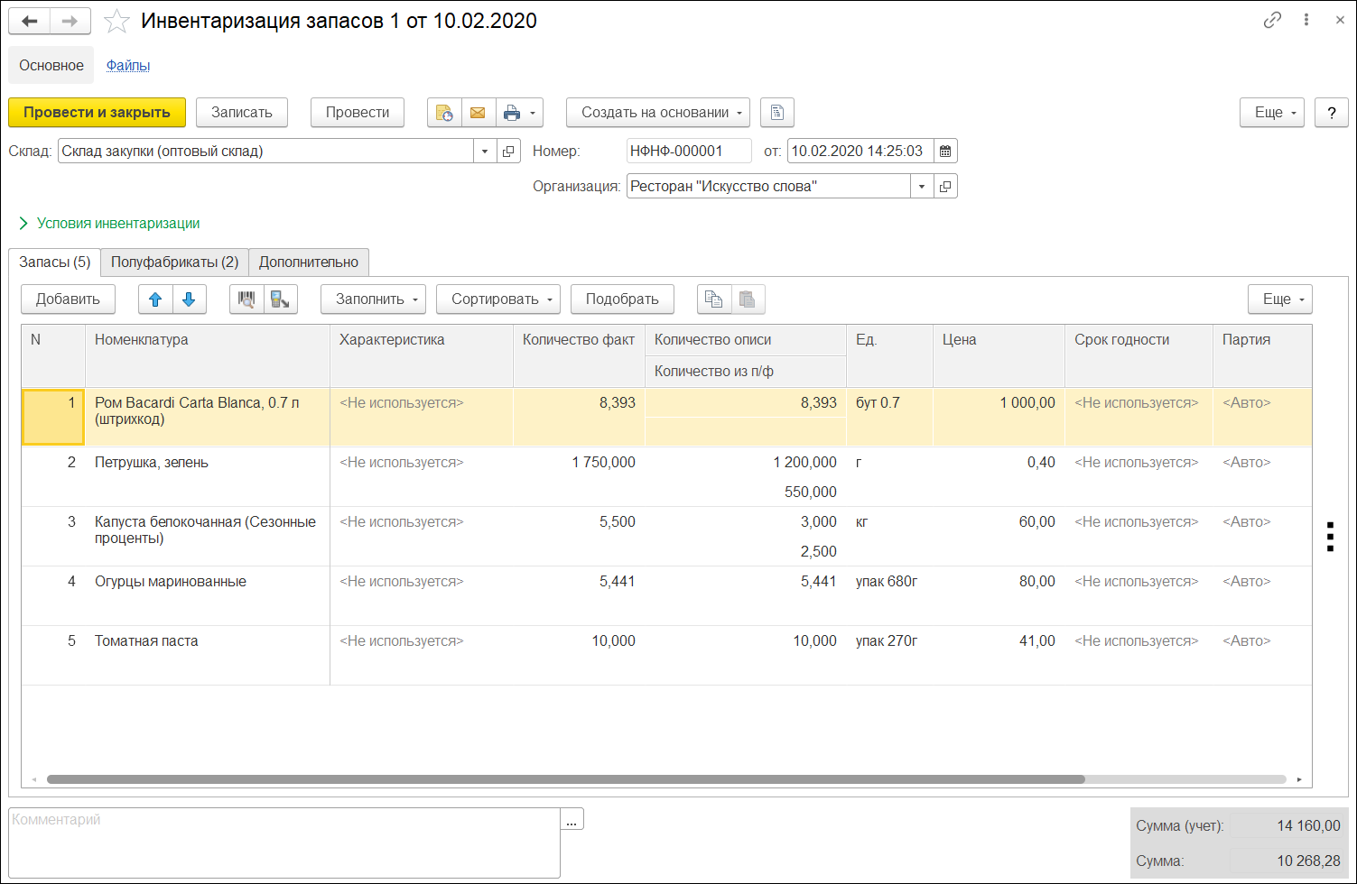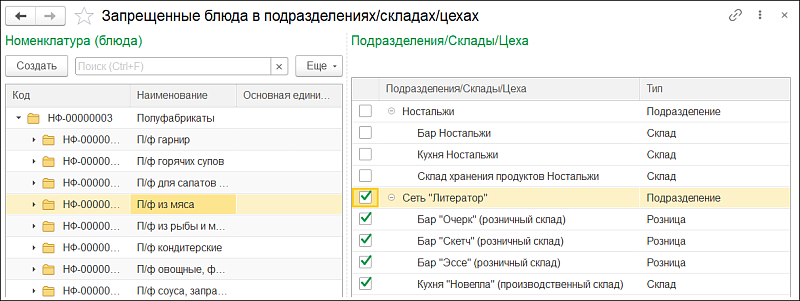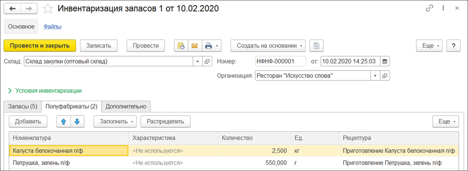Также есть возможность проводить инвентаризацию полуфабрикатов и готовых блюд с автоматическим раскладыванием их на ингредиенты согласно рецептурам.