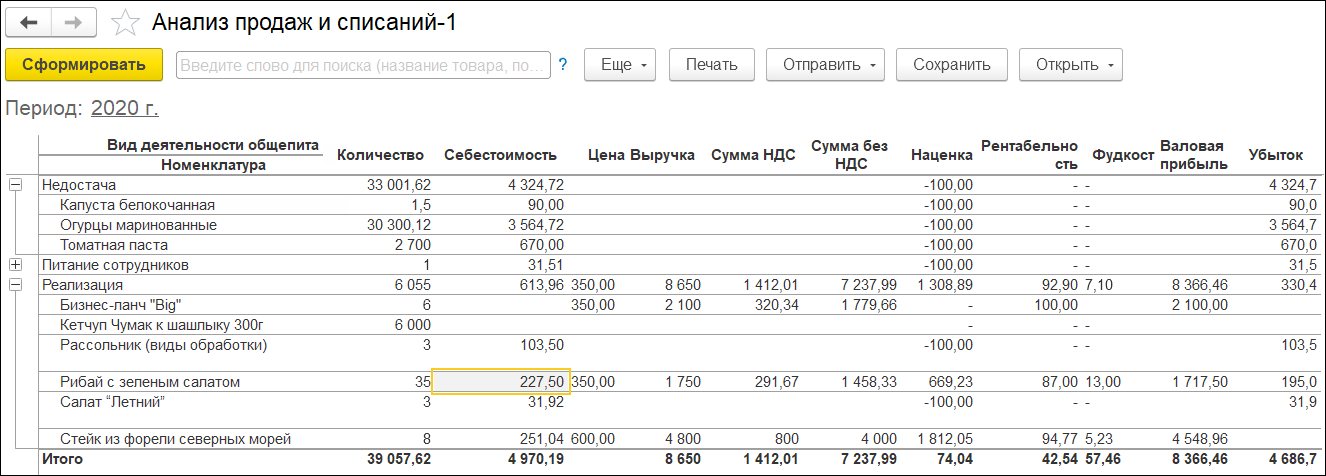 Анализ продаж и списаний – получить общие показатели деятельности с учетом продаж и прочих операций.