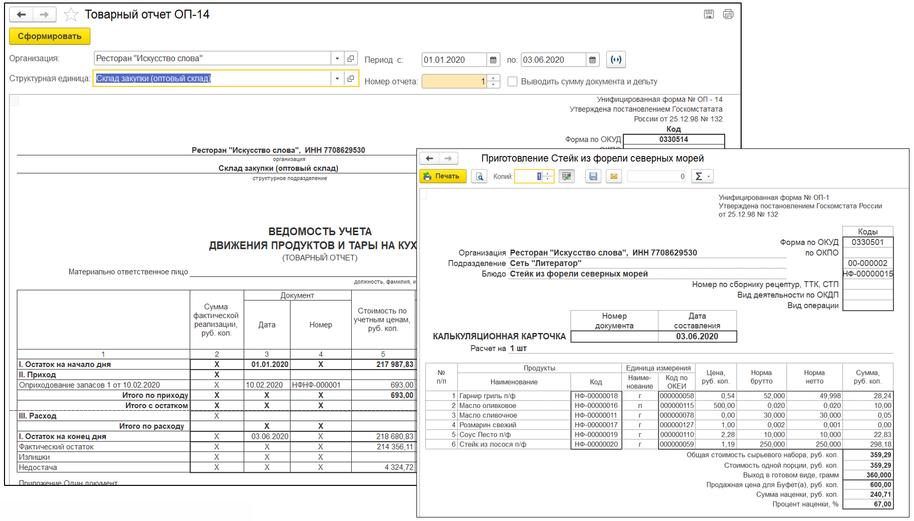 Предусмотрена возможность печати необходимого набора унифицированных форм серии «ОП» для предприятий общественного питания.