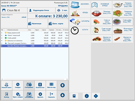 Типовые настройки интерфейса дополняются функциями переключения режима «день/ночь» для работы в помещениях с ярким освещением или на улице. Также появился вариант интерфейса для предприятий быстрого общественного питания или столовых, при котором на рабочем месте постоянно закреплены «горячие клавиши» с популярными позициями из меню заведения.