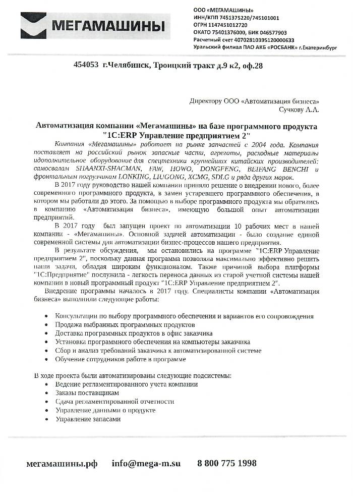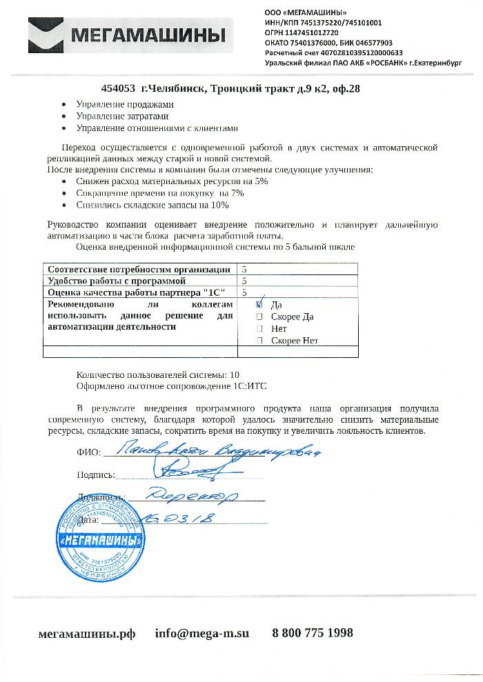 В результате внедрения программного продукта организация ООО «МЕГАМАШИНЫ» получила современную систему, благодаря которой удалось значительно снизить материальные ресурсы, складские запасы.