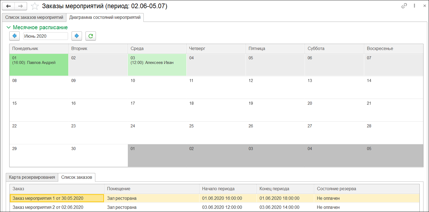 Вкладка "Помещения" позволяет менеджеру планировать занятость залов и видеть все предстоящие мероприятия. В календаре учитывается график работы заведения, можно задавать типы помещений и временной шаг (до получаса). Цветовые индикаторы помогут сотруднику быстрее ориентироваться в таблице, в том числе по времени начала и окончания мероприятия. Кликнув на событие можно перейти прямо в заказ.