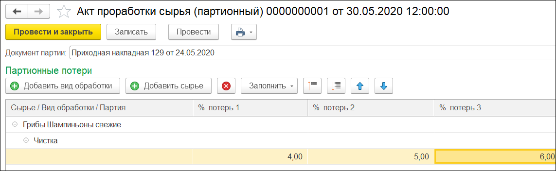 Учет потерь в разрезе партий сырья. На каждую партию можно делать отдельный процент отходов. В акте проработки сырья можно указать процент потерь в разрезе партий и в момент выпуска блюда эти параметры будут учитываться. Таким образом, при наличии в запасе нескольких партий одного сырья различного качества (например, с различным процентом потерь при дефростации) и использовании этих партий в рамках одного Выпуска продукции усреднения процента потерь не произойдет и списание будет максимально корректным.